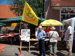 Auf dem Bild ist der Stand der Schutzgemeinschaft Filder und dem Aktionsbündniss Birkach-Plieningen zu sehen. Hier wird gegen eine 2.Start- und Landebahn mobil gemacht und die Einwohner werden informiert.
